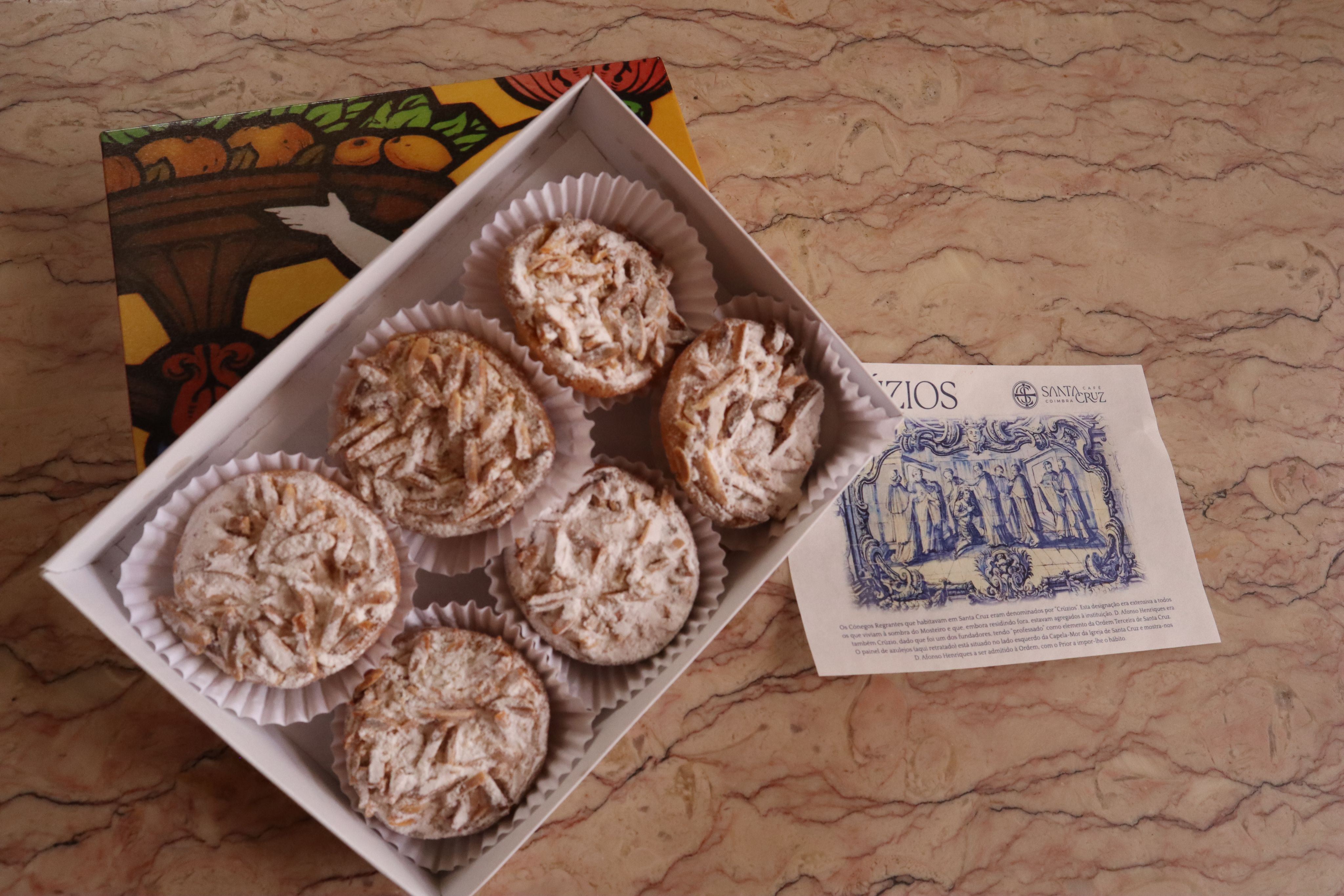 Enquanto ainda era Café-Restaurante, o Café Santa Cruz fazia serviço de catering em casamentos, onde teve origem a receita do típico bolo Crúzio. O nome do bolo foi atribuído em referência aos Cónegos Regrantes que habitavam no Mosteiro de Santa Cruz e eram conhecidos por Crúzios. Na caixa onde se vende o doce conventual encontramos um texto da autoria do Padre Dr. José Bento Vieira, antigo Cónego da Diocese de Coimbra e Prior da Igreja de Santa Cruz, onde se lê o seguinte: