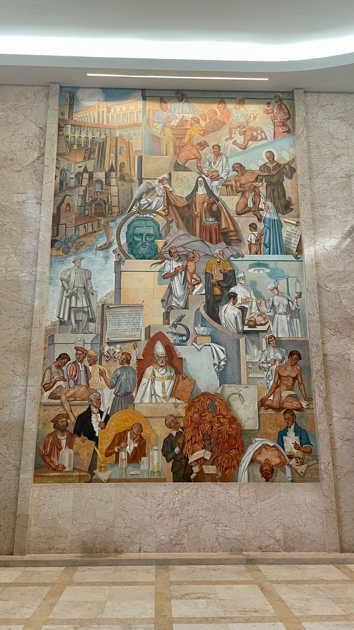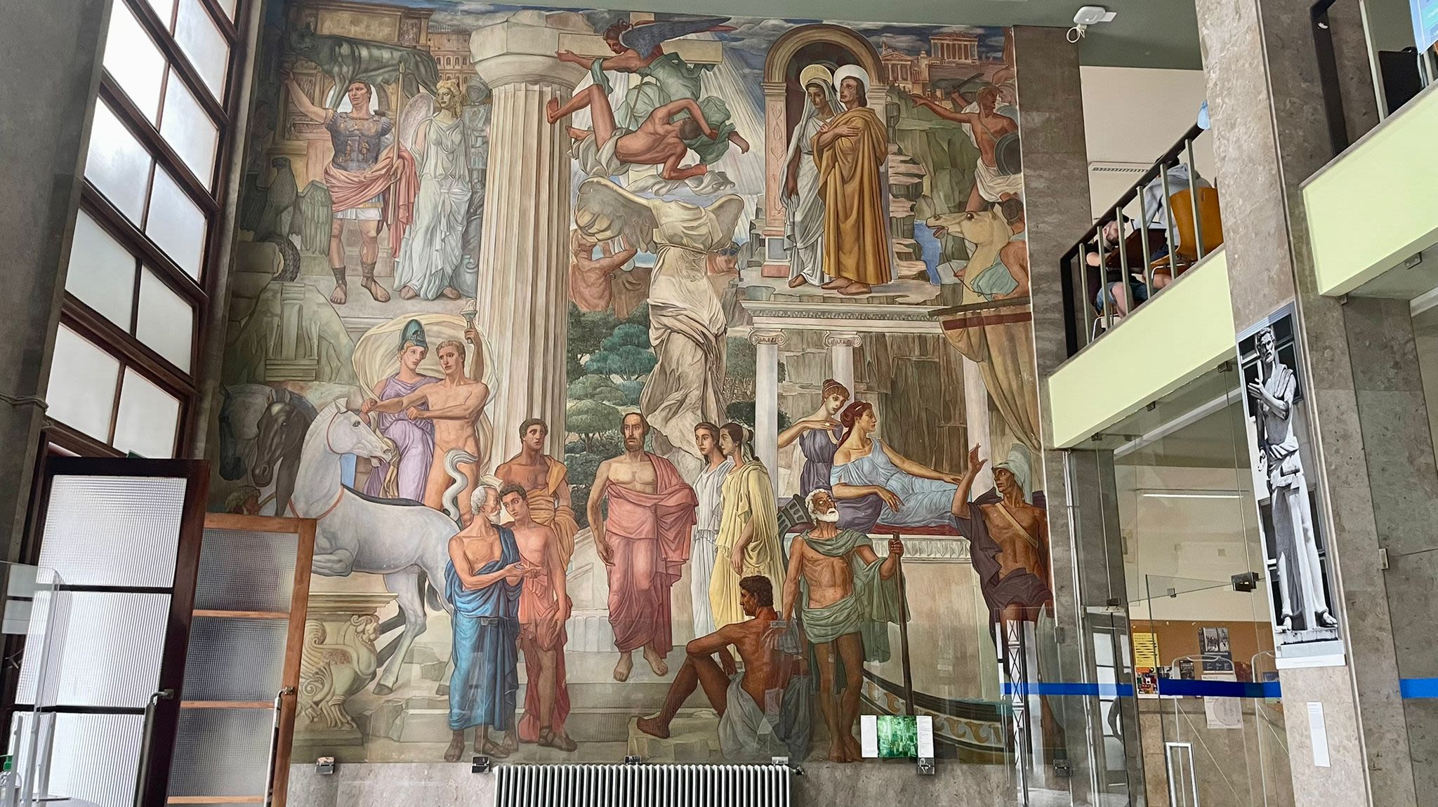 No interior dos edifícios, os painéis nas paredes da entrada têm em conta a própria faculdade em que se encontram.